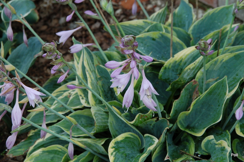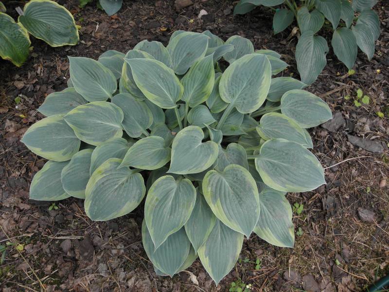 Rozmiar M wysokość 35-40 cm Liście: sercowate.. niebieskie z początkowo zielonkawo żółtym, następnie żółtym marginesem... dobrej substancji Kwiaty: lawendowe (VII/VIII) Zalecane stanowisko: pólcień/cień