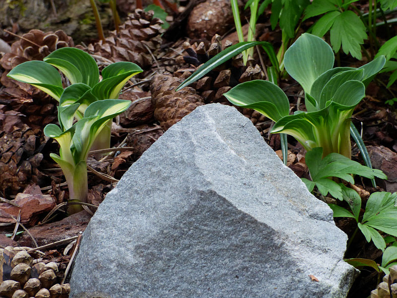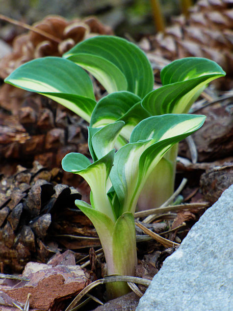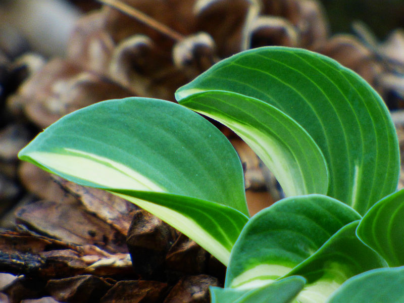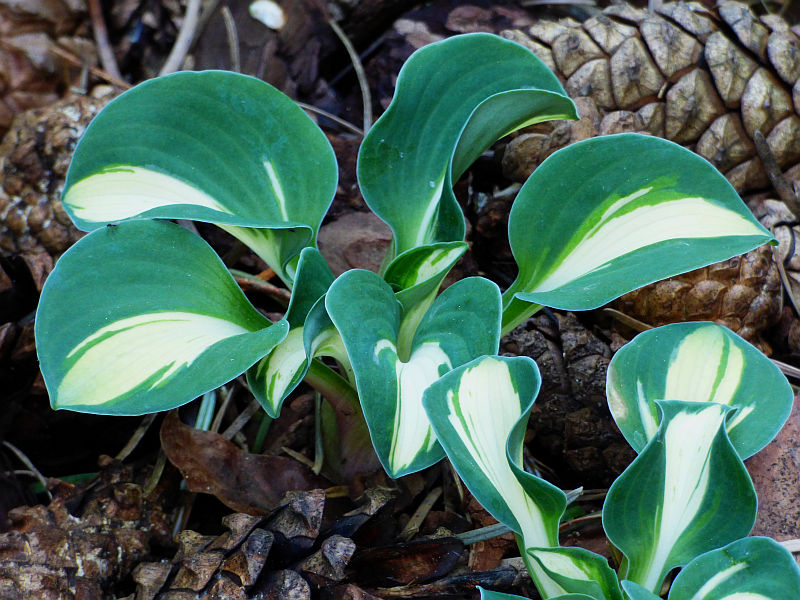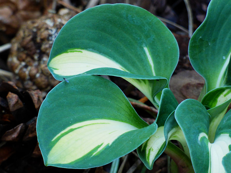 Liście: okrągłe, twarde... początkowo kremowo białe, szybko rozjaśniające się do czystej bieli centrum, częstokroć z zielonymi smużeniami i niebieskawo zielonym marginesem