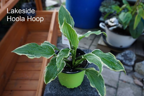 Rozmiar S/M wedle danych rejestracyjnych ma osiągać 30 cm wysokości przy takiej samej szerokości Liście: lancetowate, o wymiarach 13 x 5 cm... zielone, błyszczące, z mocno pofalowanym, żółtym marginesem Kwiaty: lawendowe w paski (VII/VIII) na 50 cm łodygach Zalecane stanowisko: od słońca do cienia