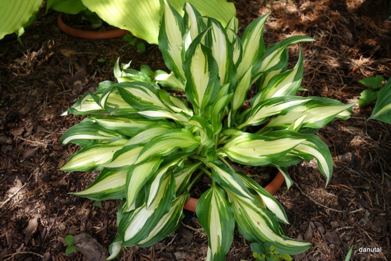 Rozmiar: S wysokość 15-25cm Liście: długie,lancetowate, poskręcane, spiczasto zakończone, lekko błyszczące; biało-kremowe centrum z zielonym, lekko pofalowanym,nieregularnym marginesem Kwiaty: jasno-lawendowe z purpurowymi paskami w sierpniu na ulistnionych łodygach Zalecane stanowisko: półcień do cienia