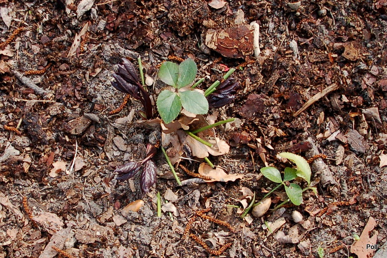 Na tym samym poziomie hostowiska rosną też inne ciemierniki, sporo bardziej zaawansowane w rozwoju. Każdy ma nieco inny kolor, bo liczę na ciekawe krzyżówki i zmienność cech siewek.