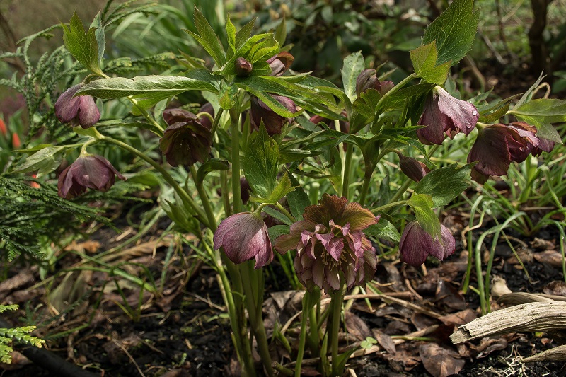 Nieco wyżej, ma swoje stanowisko ciemiernik 'Pretty Ellen Red' o ciemnoczerwonych, pojedynczych kwiatach