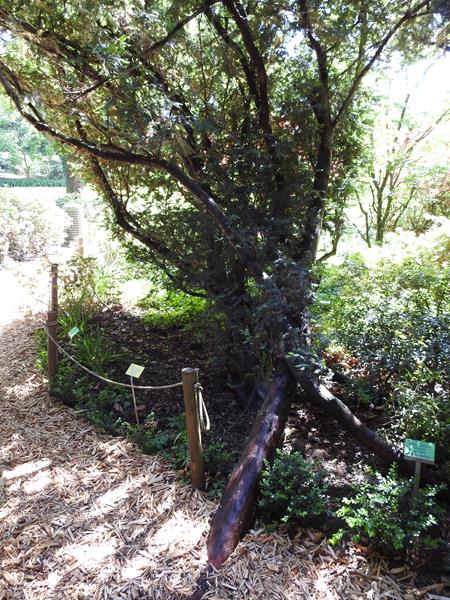 Zimozielone niewysokie drzewo, o wysokości zwykle do 15 m (maksymalnie do 28 m), lub krzew o wysokości do 3–4 m. Pierśnica dorasta do 80 (140) cm. Korona ciemnozielona, zwykle jajowato-stożkowata, u starych drzew lub osobników krzewiastych nieregularna. Często roślina wielopniowa. Formy krzewiaste pojawiają się najczęściej w wyniku wczesnej straty pędu wierzchołkowego i zastąpienia go kilkoma innymi. Pień z reguły obficie, nieregularnie ugałęziony, przy czym nawet ze starych pni i konarów wypuszcza wciąż młode odgałęzienia. Kora wiśniowo-szara lub ciemnobrunatna, później rdzawoszara, łuszcząca się cienkimi płatami. Młode pędy przez 2–4 lata pozostają zielone.