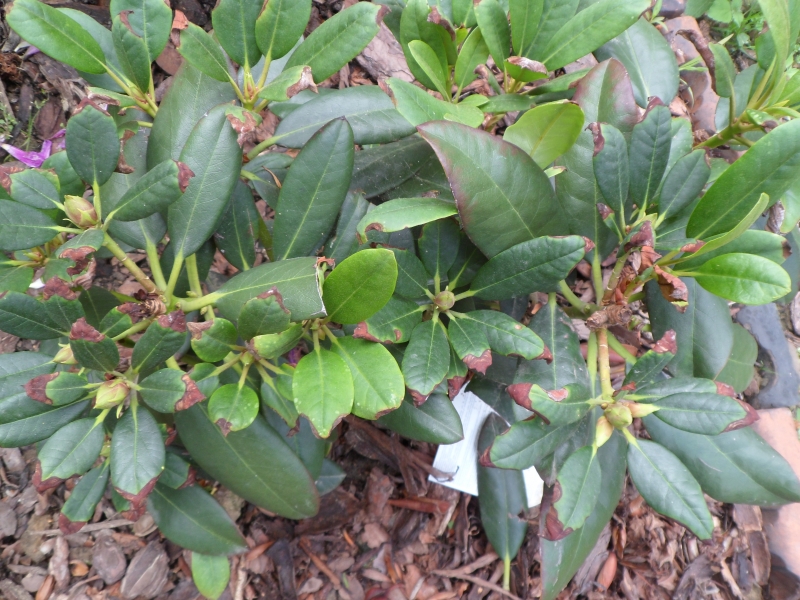 Moje rododendrony w tym roku zrzuciły sporo liści. Przyczyna jest prosta. Liście zrzucone, to liście zeszłoroczne. A zeszły rok, zwłaszcza lato były dla rodków straszne. Niesamowity upał i suchość powietrza (zwłaszcza powietrza, bo rodki podlewałam regularnie)sprawiły, że rośliny ledwie zipiały. Tak też z ulgą teraz zrzucają te liście, które ledwie mogły utrzymać. Taka jest moja obserwacja z wieloletnich upraw rodków zwłaszcza tych po przejściach. A w zasadzie to oprócz dwóch, wszystkie właśnie pochodzą z różnych ogrodów, gdzie coś im nie pasowało.