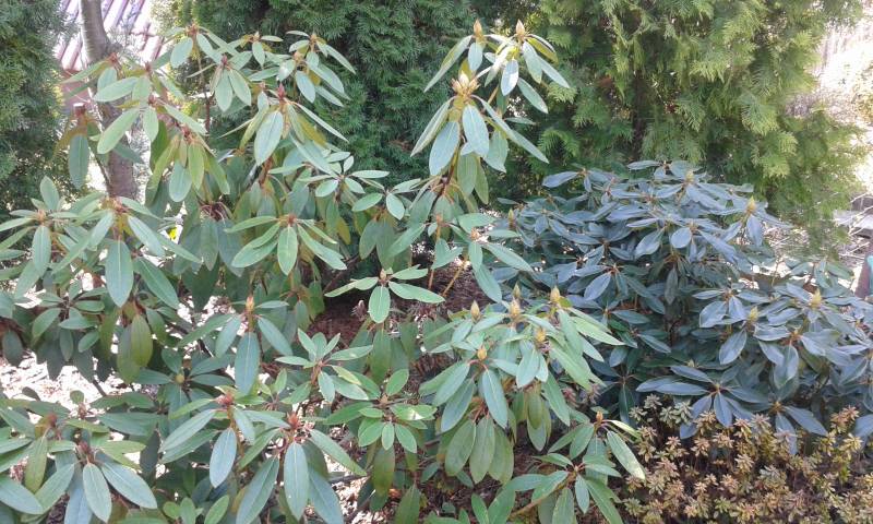 W ubiegłym roku sadząc rh od razu podsypałam granulowanym obornikiem końskim, w tym nowo posadzonych jeszcze nie nawoziłam, mam zamiar zastosować dolistnie Magiczną Siłę dopiero po kwitnieniu. Rośliny dobrze przezimowały (młode rh i japonki okryłam włókniną), mają ładne, zielone liście.