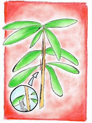 2. Z sadzonki usuwamy pąki kwiatowe oraz wszystkie dolne liście, pozostawiając jedynie 3 do 5 liści na szczycie. Dłuższe z pozostawionych liści powinniśmy również skrócić o połowę celem zmniejszenia procesu utraty wody przez transpirację. Następnie: