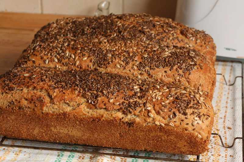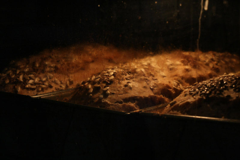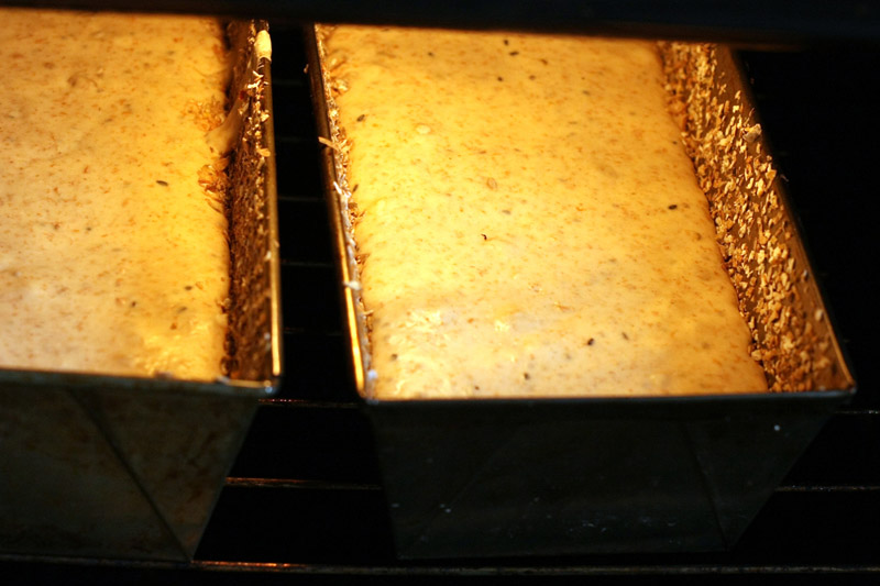 Czekać do wyrośnięcia. Po wyrośnięciu zbijam i tak 3 razy. Keksówki smaruję tłuszczem i wysypuję otrębami. Wkładam ciasto, smaruję z wierzchu rozbełtanym białkiem i posypuję słonecznikiem i prażonym siemieniem lnianym. Jeszcze pozwalam trochę podrosnąć w foremkach i do pieca.