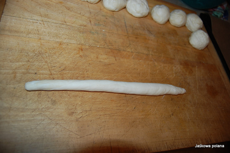 Z ciasta formujemy długie,wąskie,kilkunasto centrymetrowe wałeczki