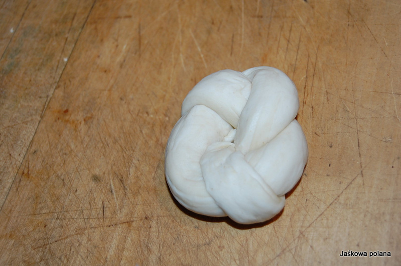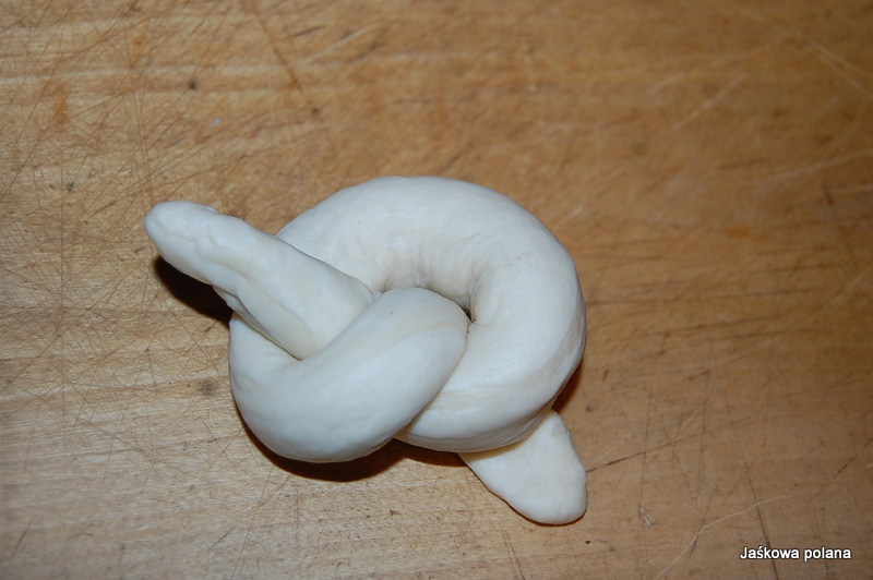 Wałeczek ciasta zawiązujemy w pętelkę z dziurką i każdy koniec owijamy wzdłuż tej pętelki.