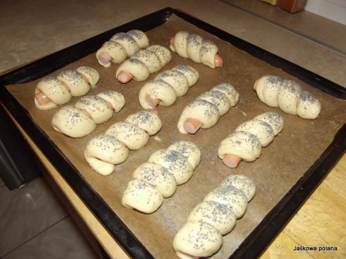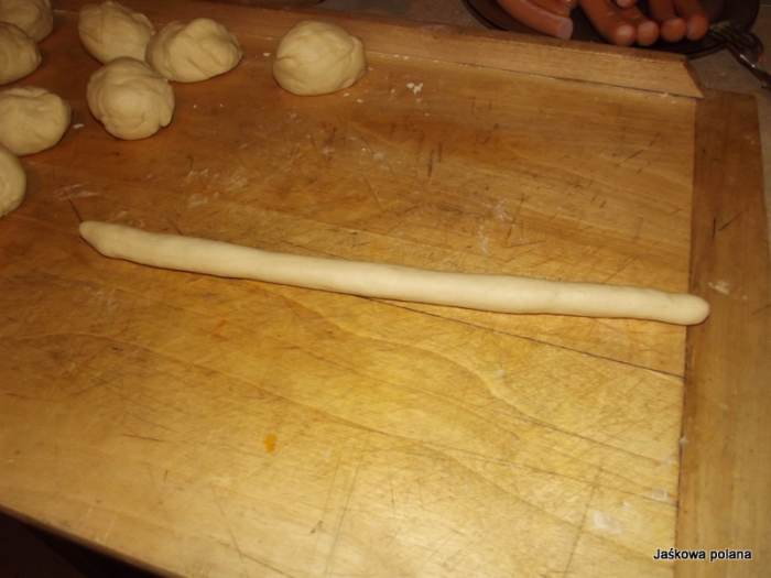 i owijamy każdą parówkę ciastem.Podczas formowania najlepiej nie używać mąki,gdyż lepiej się formują.