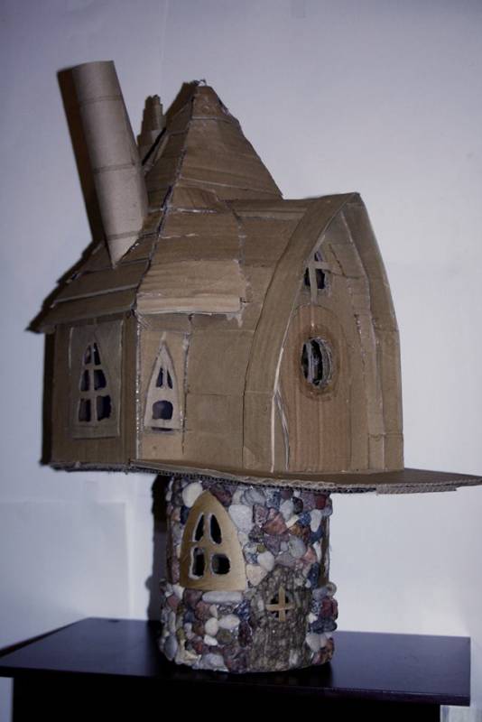 Ramy okien póki co zrobione są z grubej tektury na którą nakładać będę dopiero papkę celulozową, którą widać już na drzwiach zameczku