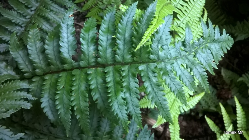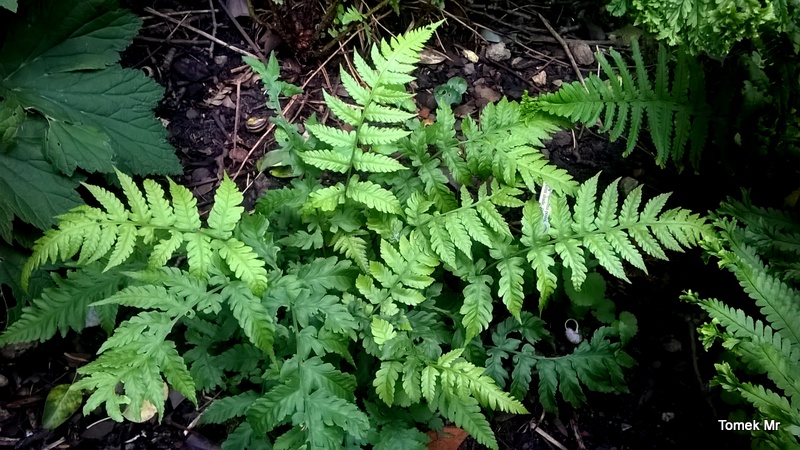 Dryopteris uniformis. o lekko rozszczepionych końcówkach . Po lewej, na dole, fragment Drypteris pulcherrima