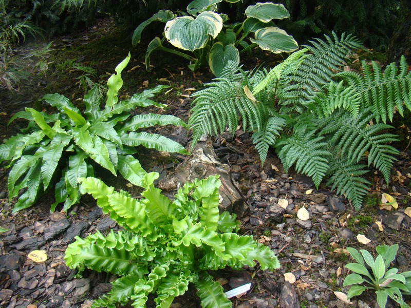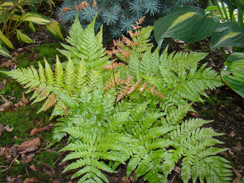 Drypteris pulcherrima w całej okazałości (po lewej, widoczny Dryopteris mamegatae, u góry, hosta 'Jaws')