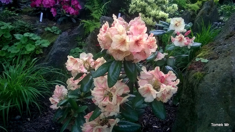 Kwiaty: w pąku pomarańczowo różowawe, po otwarciu wewnątrz początkowo miedziano żółte, z czasem kremowe z wyraźnymi, purpurowymi cętkami na górnych płatkach, na zewnątrz bladoróżowe i pręgowane... dzwonkowate... bardzo duże, średnica pojedynczego kwiatu do 11 cm... zebrane po 5-10 sztuk w luźne, wierzchołkowe kwiatostany