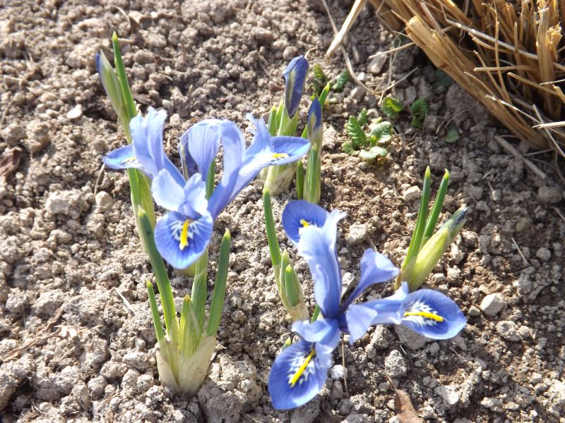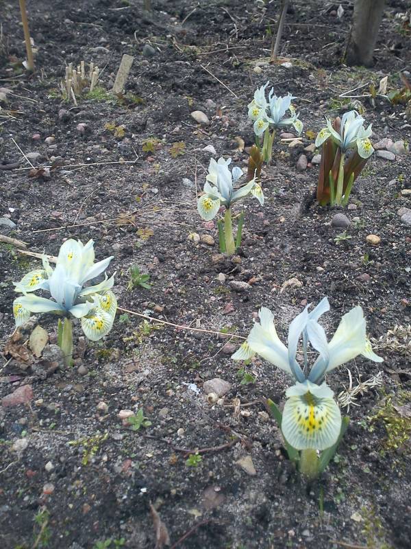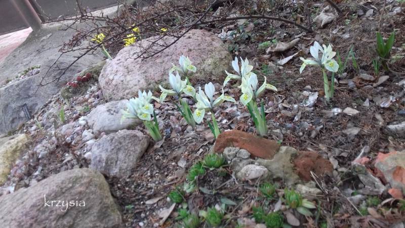 Hermodactyloides hojnie stosować kompost i żwir. Ten ostatni rzecz jasna na drenaż. Przestrzegała przed stosowaniem torfu (jak najbardziej słusznie), nawet odkwaszonego, bo wiąże wodę w glebie także latem, kiedy te irysy muszą mieć sucho jak na Saharze. To naprawdę były dobre rady! Jak pisałam, większość irysów z tego podrodzaju, a na pewno wszystkie te uprawiane w naszych ogrodach, kwitnie bardzo wcześnie. To dobre towarzystwo dla ranników i przebiśniegów.