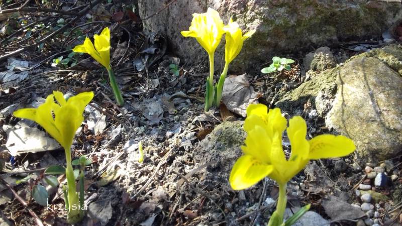 Iris danfordiae - czyli po polsku kosaciec Danforda. Roślina pochodzi z Turcji, została sprowadzona do Europy w 1876 roku przez Mrs CG Danford (łowczynię roślin, takie zajęcie było bardzo cenione w wiktoriańskiej Anglii). To niewielka, dorastająca zaledwie do 15 cm (pędy kwiatowe) "irysina" o delikatnie pachnących jasnożółtych kwiatach, pojawia się na rabacie bardzo wcześnie, często już w lutym możemy zobaczyć kwitnące iryski Danforda (czy nie powinno być iryski Danfordowej?