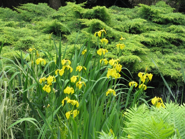 Kwitnący, botaniczny Iris pseudacorus w przydomowym "bagienku"