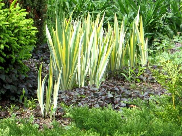 Cały rok wyglądający bardzo atrakcyjnie, przywieziony z południa Europy i niewymarzający na Mazurach, Iris pallida ( tu odmiana "Variegata")