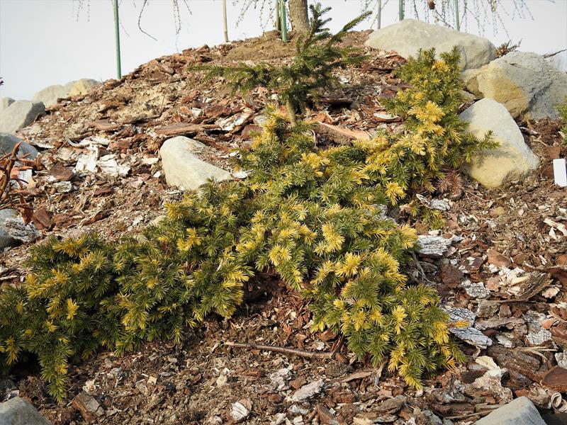 Wolno rosnący, iglasty krzew okrywowy o dwubarwnych, złocisto-zielonych gałązkach. Po 10 latach uprawy dorasta do 0,2 m wysokości i około 0,5 m szerokości. Pędy są krótkie, rozpostarte na wszystkie strony, ścielące się po ziemi. Gałązki obficie i gęsto ulistnione, zielone z licznymi zabarwionymi na żółto fragmentami rozproszonymi przypadkowo w obrębie rośliny. Mrozoodporny