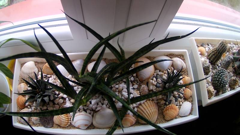 sansewieria 'Fernwood' w środku a po obu stronach dwie haworsje
