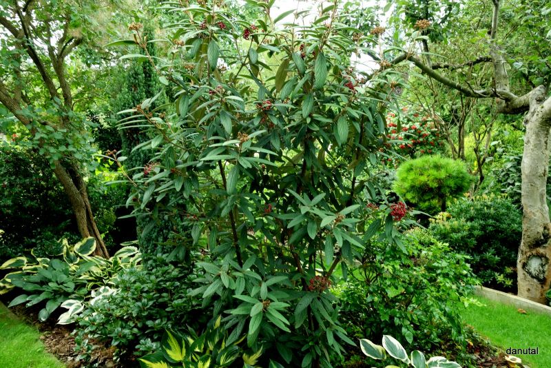 Kalina sztywnolistna (Viburnum rhytidophyllum) 07.06.2021 już powoli przekwitała w Arboretum w Wojsławicach. Osobiście przypadły mi do gustu błyszczące liście tej kaliny.