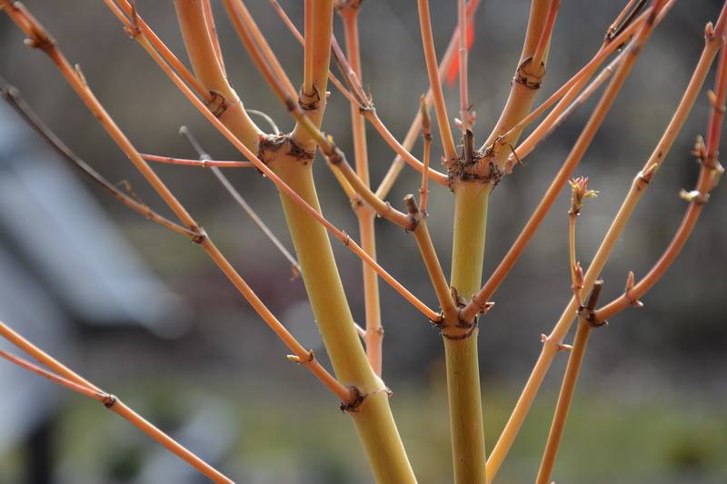 Sango Kaku cudnie się przebarwia na przestrzeni sezonu (ma w dodatku fantastyczne czerwono-różowe zabarwienie pnia i gałązek), a