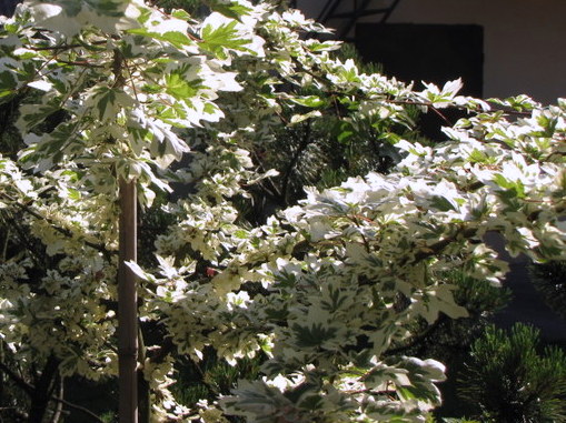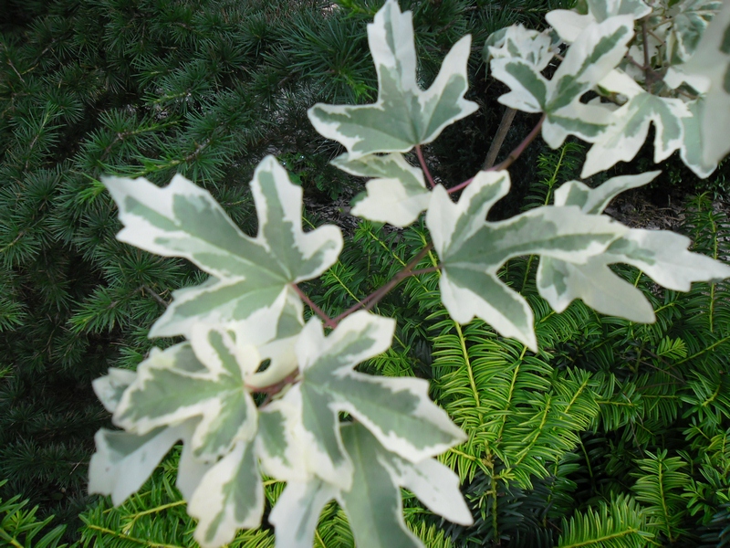 Liście: 3- do 5-cioklapowe, do 10 cm szerokości, zaokrąglone, dwukolorowe: ciemnozielone centrum z szerokim, kremowobiałym obrzeżem, młode liście i pędy różowawe
