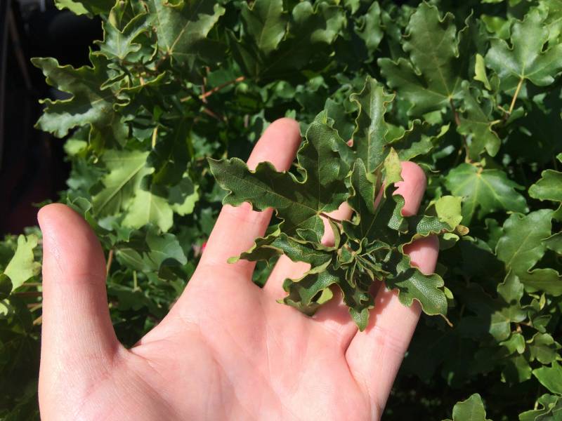 Liście: 3- do 5-cioklapowe, nieco mniejsze niż u gatunku, o długości do 7 cm i podobnej szerokości... wiosną jasnozielone, latem zielone, lekko błyszczące, jesienią przebarwiają się na kolor ciemnożółty