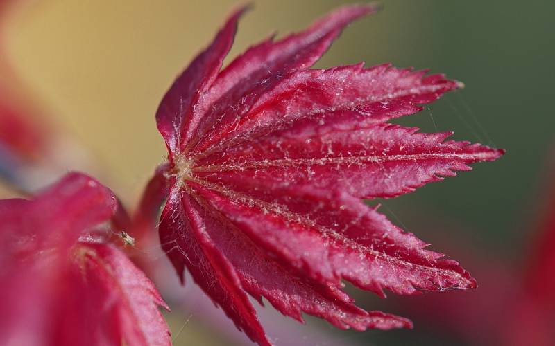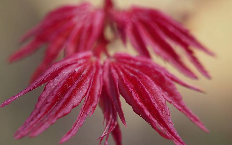 Liście: nieduże o średnicy około 5 cm. Wczesną wiosną ogniście czerwone żeby przebarwić się na różowo-czerwone, latem zielone, a jesienią pomarańczowe i czerwone. Do jesieni klon wypuszcza nowe, czerwone przyrosty więc jest kolorowy przez cały sezon