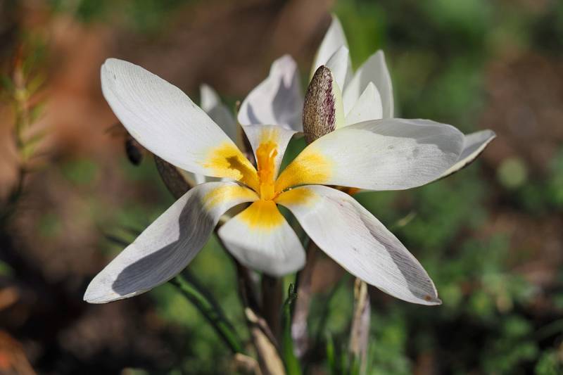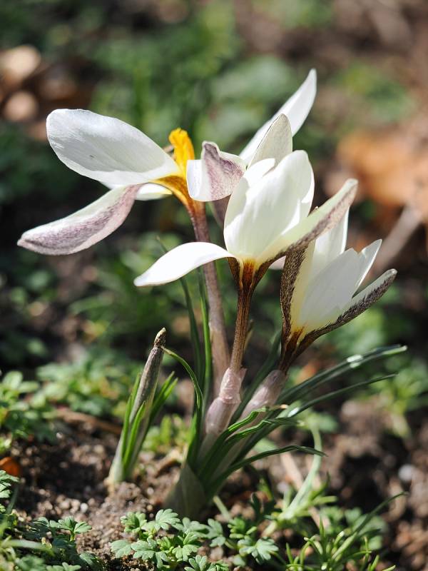 Crocus alatavicusMAGNAT ALATAU ... największa i jedna z najwcześniejszych odmian tego krokusa. Duże białe kwiaty z jasnoszarym tłem i kremowobiałymi brzegami.