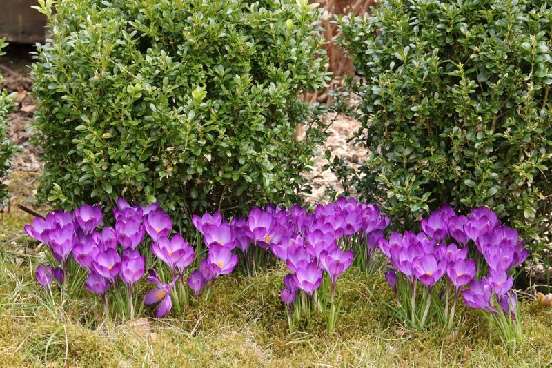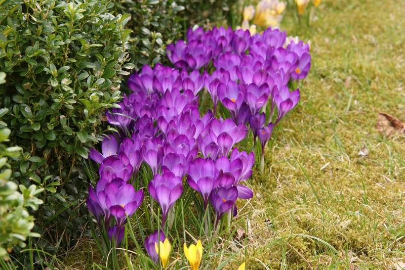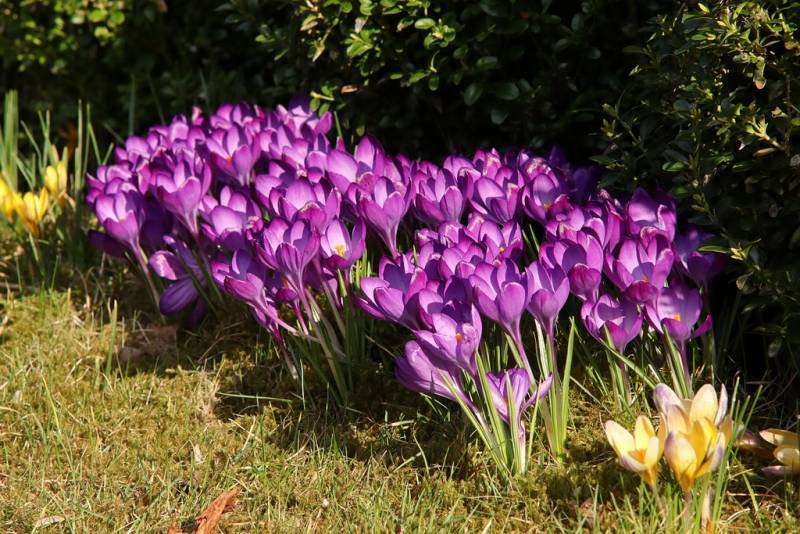 Ostatnie w tym sezonie kwitnienie Krokusów 'Ruby Giant' na stanowisku, gdzie wczesną wiosną nie docierało dotychczas światło słoneczne. Teraz już dociera (późnym popołudniem) bo nasi sąsiedzi skrócili o połowę swój ogromny żywopłot z Żywotnika
