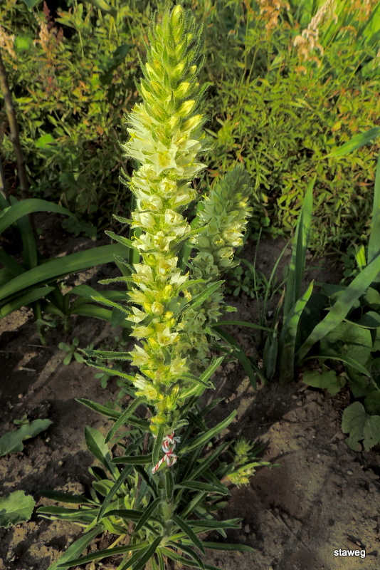 Kwitnie od połowy czerwca, czasem nawet do końca sierpnia. Kwiaty - małe owłosione dzwonki koloru zielonkawożółtego, zebrane w kłosy osiągające wysokość do 60 cm.