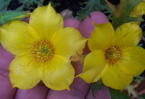 Liście i łodygi mają sinawy kolor, a od czerwca do września pojawiają się spore, złocisto-żółte kwiaty o pięciu sercowatych płatkach, z "czupryną" dekoracyjnych pręcików.