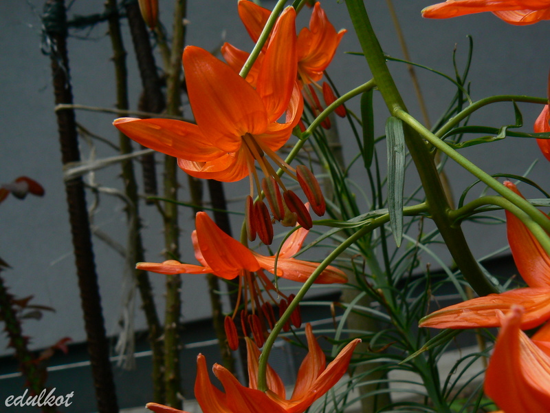 Lilium pumilum czyli Lilia drobna została opisana po raz pierwszy w 1812 roku przez Augustina Pyramusa de Candolle, botanika szwajcarskiego. Rośnie naturalnie na terenach Mongolii, Syberii, Mandżurii, Korei i w północnych Chinach. Przykra wiadomość jest taka, że to roślina krótkowieczna, czterolatka to już Matuzalem w gatunku. Dobra wiadomość - łatwo rozmnaża się z nasion. Roślina nie jest wysoka, jak zresztą sama nazwa świadczy, jeżeli osiągnie 80 cm to już dobrze, na ogół bywa niższa. Kwiat turbankowy, lśniący, jakby nawoskowany, barwy czerwono-pomarańczowej. Z moich doświadczeń wynika, że im lepsze ma warunki, tym bardziej zmierza ku żarówiastej czerwieni, tym więcej ma też kwiatów na pędzie - ponoć do dwudziestu. Pachnie, jakkolwiek uważam, że jest to zapach dla amatorów, można założyć, że spodoba się tym, którzy cenią woń wawrzynka lub hiacyntów. Jak dla mnie, dużo za dużo, aż strach pomyśleć, co by było, gdyby ta lilia była większa i miała potężniejszą siłę rażenia