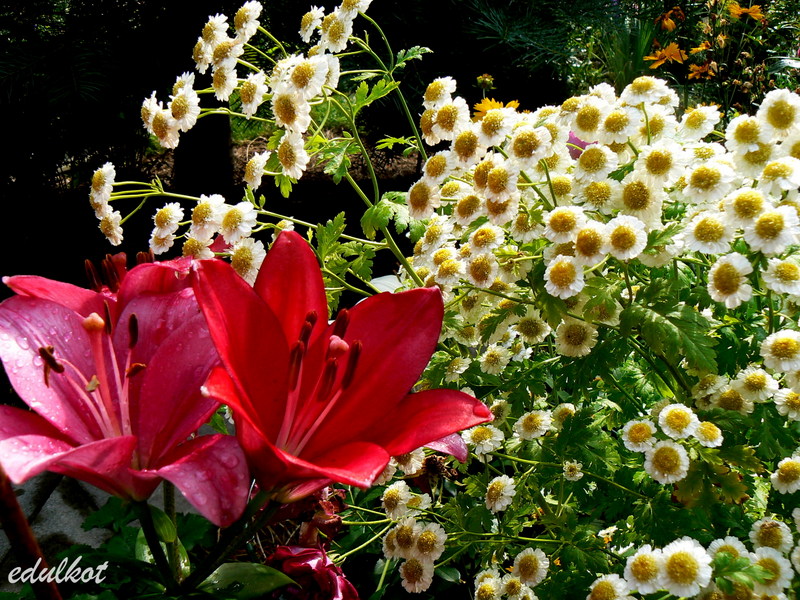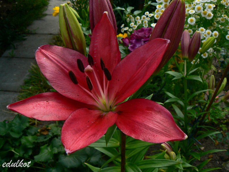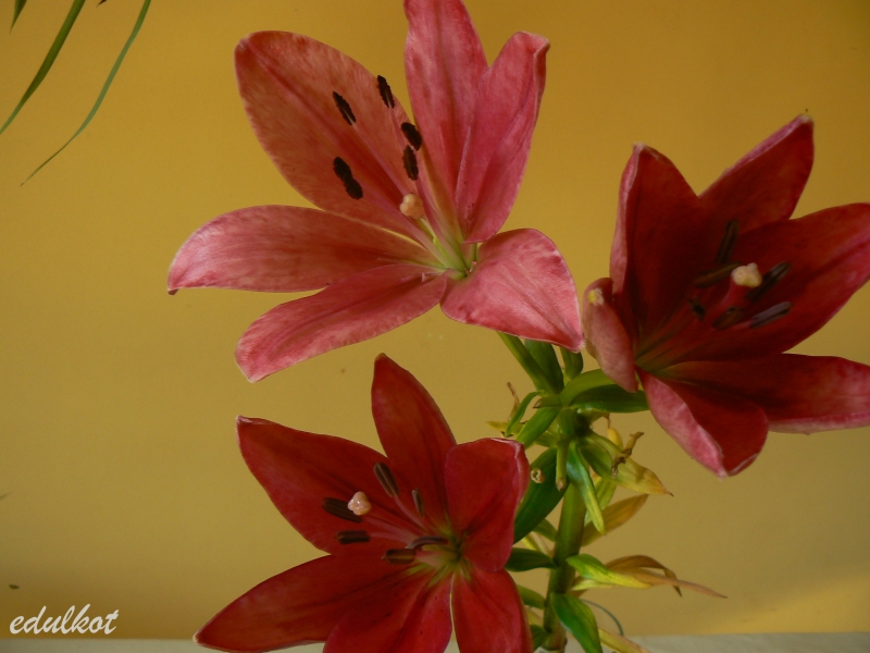 Chyba 2 tygodnie temu złamałam najwyższy i najbogatszy pęd, pączki miał jeszcze malutkie i zielone, ale było mi jej żal więc wstawiłam do wody. Zrzuciła albo jej oberwałam większość pączków, ale 3 dorosły i rozkwitły wielkością taka samą jak w gruncie. Bardzo żywotna lilia.