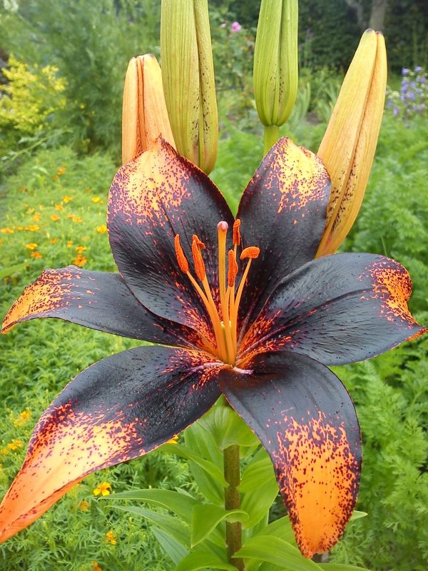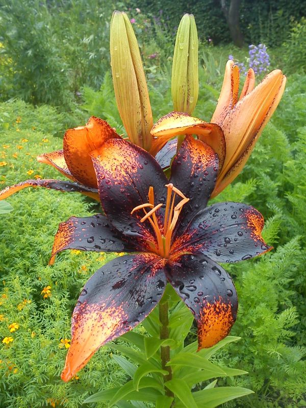 Wysokość: 90-100 cm Kwiat: ciemnobrunatna, z pomarańczowymi końcówkami płatków i wnętrzem. Lśniąca. Kwitnienie: VII Wymagania: jak u innych mieszańców azjatyckich - przeciętna ziemia ogrodowa, żyzna i przepuszczalna Mrozoodporność: wystarczająca