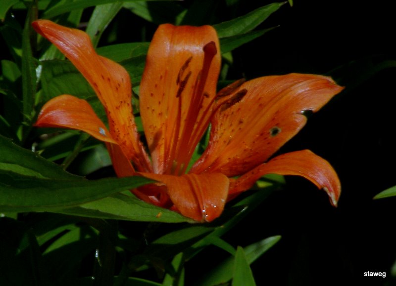Kwiaty są duże (około 17 cm średnicy), czerwono-pomarańczowawe o płatkach wydłużonych, zwężających się u nasady. Cętkowanie prawie niewidoczne.