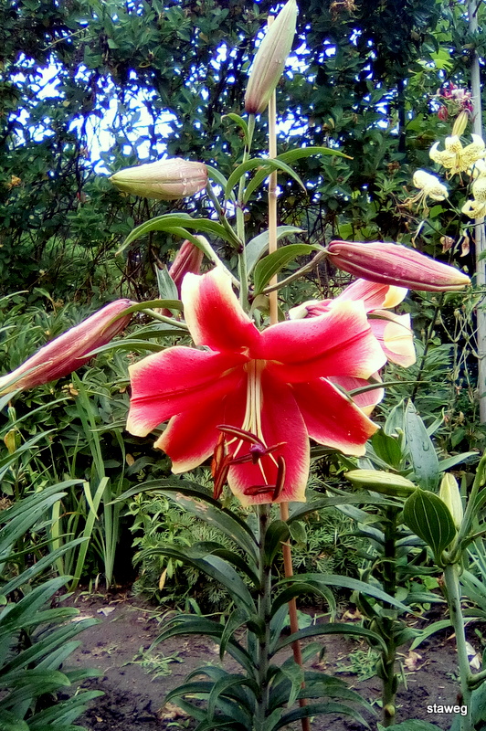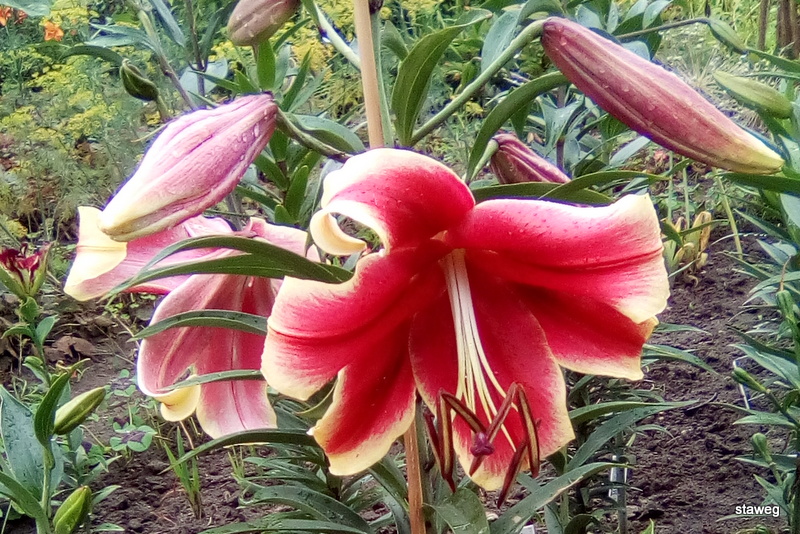 'Kushi Maya'. Ta hybryda jest nieco niższa (80-110cm), kwiaty są skierowane tym razem bardziej do góry i na boki, w kolorze czerwonym z kremowo-żółtymi brzegami.