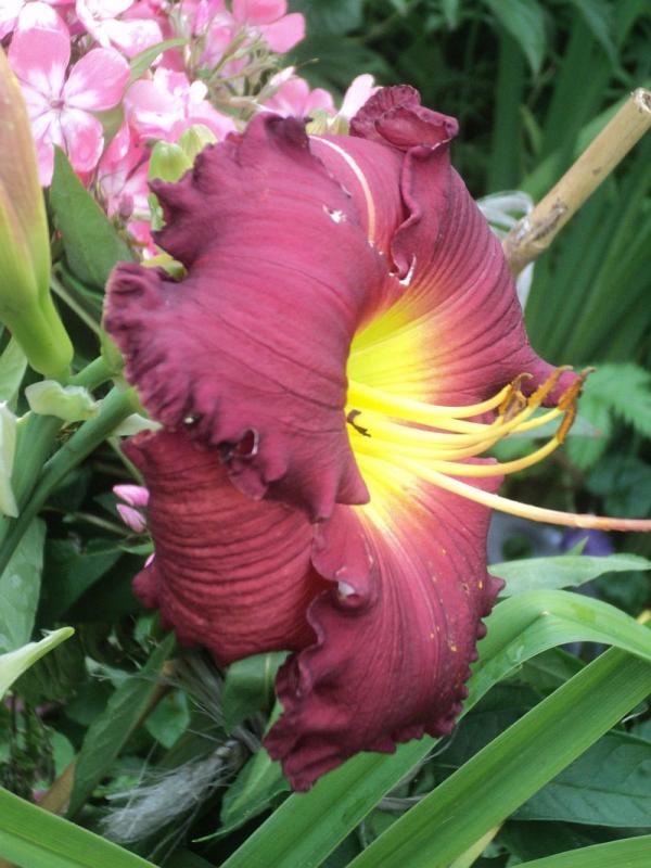 Hodowca: Shooter , rok rejestracji 2000 Wysokość: ok 60 cm Kwiaty: w kolorze burgunda z żółto- zielonym gardłem , falbanka na brzegach płatków , średnica ok 15-16 cm.