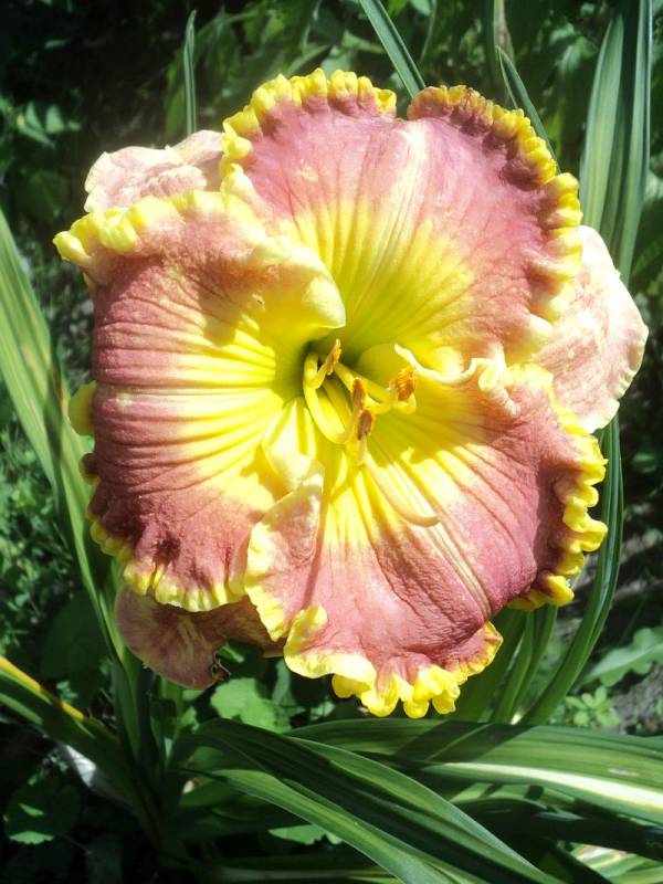 Kwiaty: różowe , z żółtym znakiem wodnym , zielonym gardłem i wyraźną żółtą falbanką , średnica kwiatu ok 16 cm.