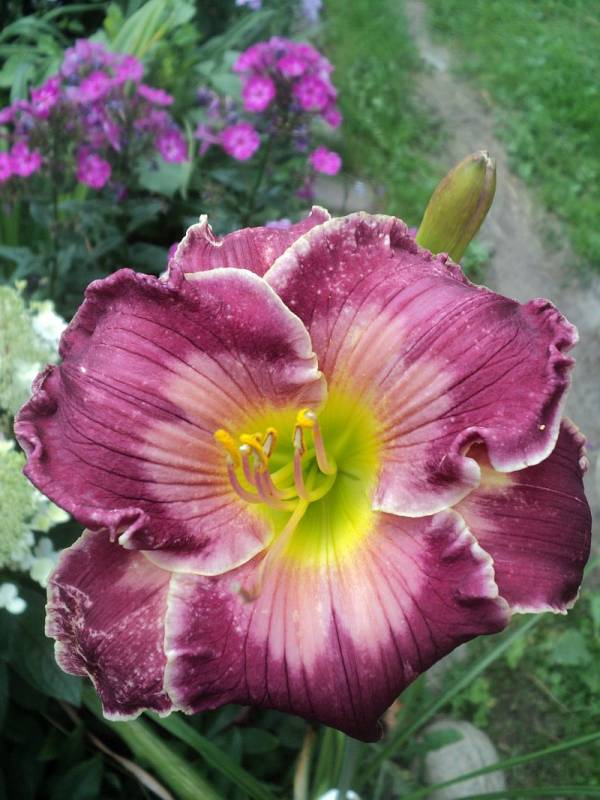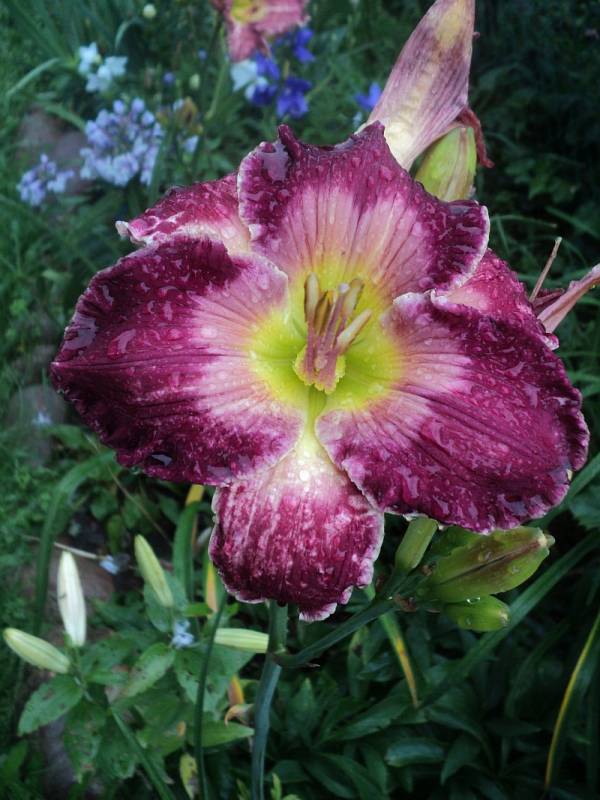 Hodowca: Rogers-C,2007 Wysokość: pęd kwiatowy na wysokości 80 -90 cm. Kwiaty:czerwono -fioletowe , z różowym znakiem wodnym nad masłowo- zielonym gardłem, brzegi płatków zaznaczone na biało leciutko sfalowane , średnica ok 15 cm , kwiat otwiera się szeroko. Zakwita w lipcu. Stanowisko: słoneczne do półcienistego. Mrozoodporność: zimuje bez okrycia.