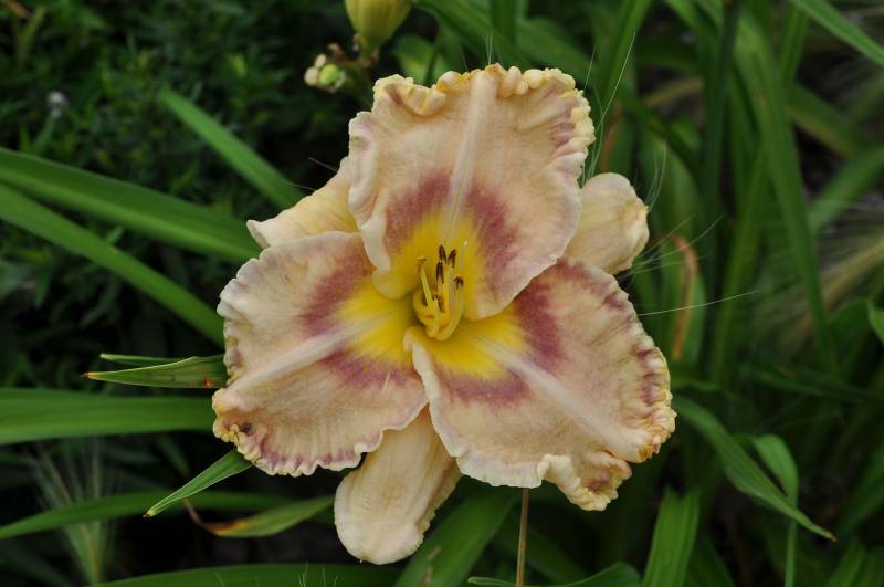 hodowca: Lambertson, 2003 wysokość: 50-60 cm kwiat: masywny kremowo-różowy z ciemniejszym okiem i żółtawym gardłem. Płatki z falbanką w ciemniejszym kolorze. termin kwitnienia: czerwiec-lipiec