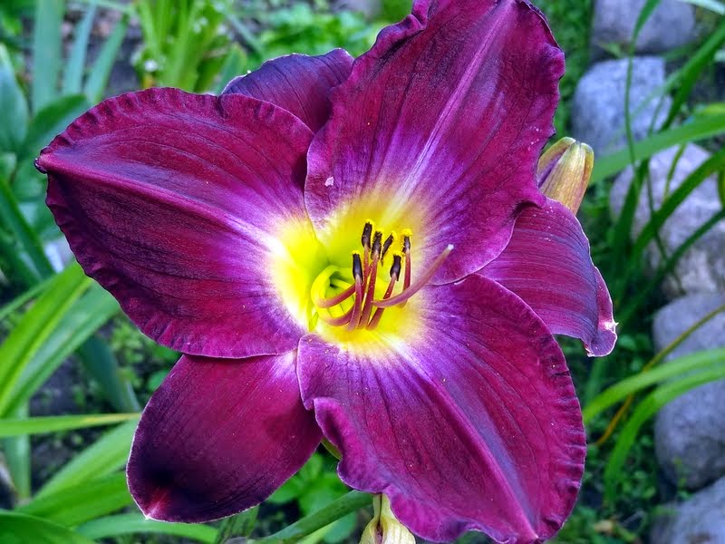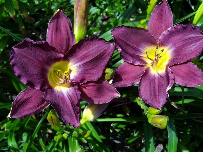 Kwiaty purpurowe, gardziel zielona; 15 cm średnicy.