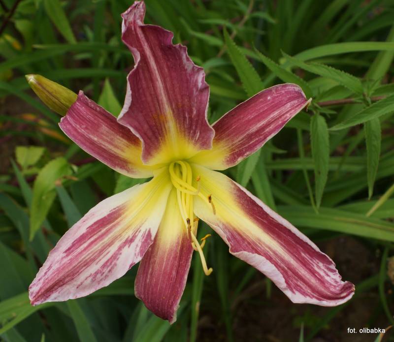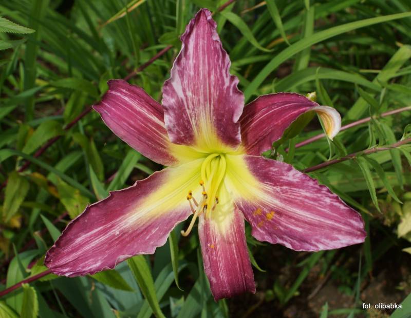 Kolor kwiatu, średnica: bordowo lawendowy z kremową polichromią, gardziel żółta; 20 cm.