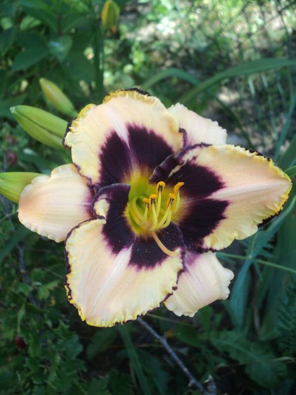 Kwiaty: łososiowo-kremowe z purpurowym okiem i obrzeżem płatków , gardło żółto- zielone , średnica kwiatu ok 15cm Zakwita w lipcu .