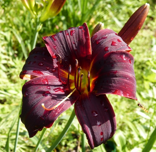 kwiat 14 cm, aksamitny czarno-czerwony z zieloną gardzielą, może powtarzać kwitnienie.