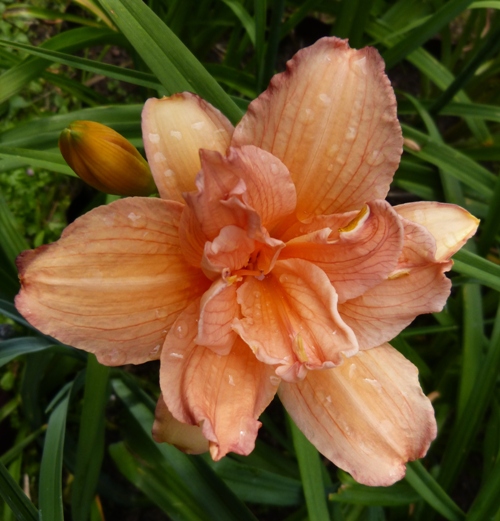 kwiat 14 cm, pełny, brzoskwiniowo różowy.