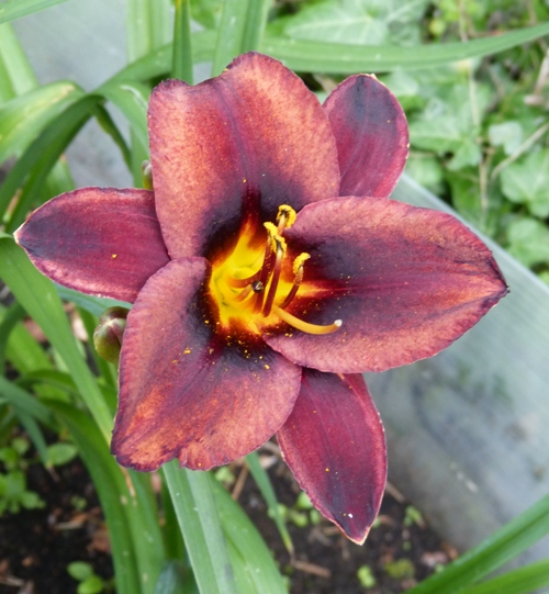kwiat 15 cm, może powtarzać kwitnienie, Brązowo purpurowy z bordowym brzegiem płatków