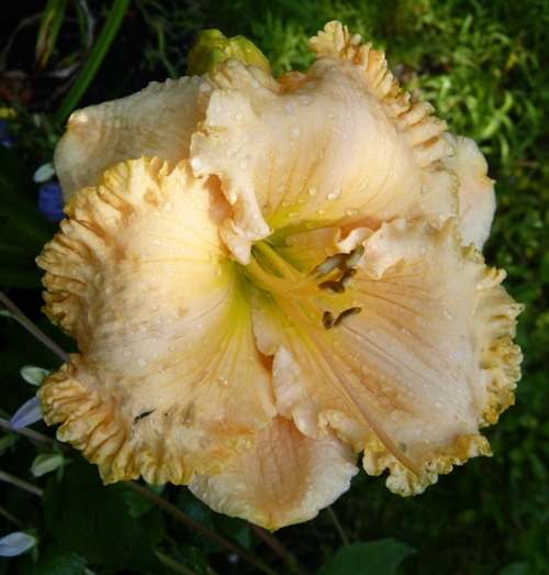 kwiat 15 cm, wielobarwny - cytrynowo melonowy z zieloną gardzielą, może powtarzać kwitnienie.