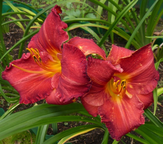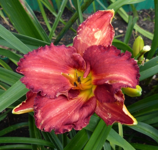 kwiat 14 cm, jasny koralowy z malinową strefą oka i złoto żółtą gardzielą